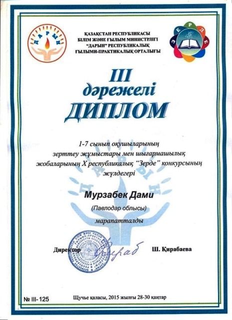 2015 жылғы 28-30 қаңтар аралығында “Балдаурен” республикалық оқу-сауықтыру орталығында өткен 1-7-сынып оқушыларының зерттеу жұмыстары мен шығармашылық жобаларының Х республикалық “Зерде” конкурсына5“а”-сынып оқушысы Мурзабек Дами қатынасып, ІІІ орынды иеленді.