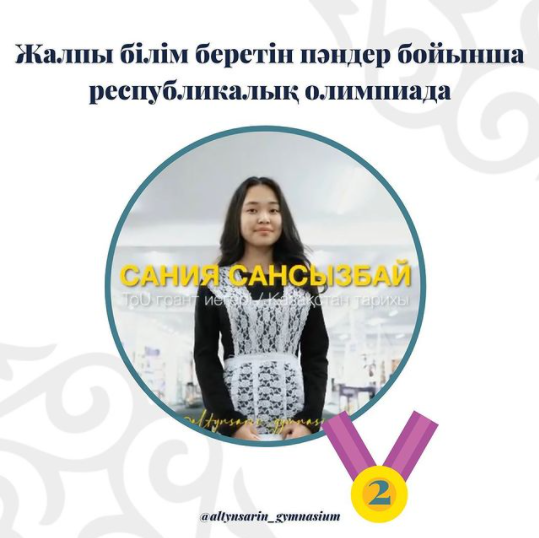 Жалпы білім беретін пәндер бойынша республикалық олимпиадада топ жарып, гимназиямыздың абыройын асқақтатқан Сансызбай Санияны күміс медалімен құттықтап, «Жарайсың!» дейміз.