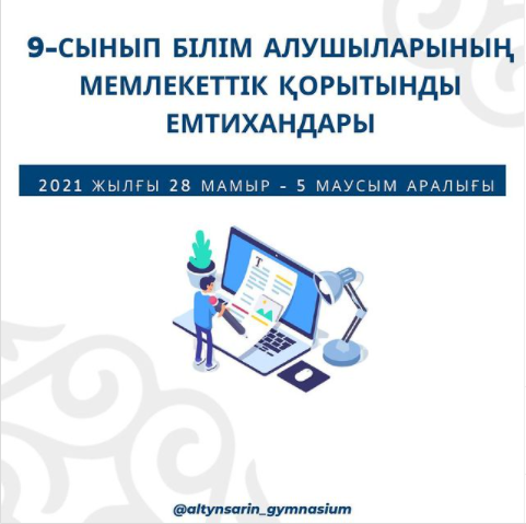 9-сынып білім алушыларының қорытынды емтихандары 19-05-2021, 16:08 9-сынып білім алушыларының қорытынды емтихандары⠀2021 жылғы 28 мамыр - 5 маусым аралығы.⠀28 мамыр Қазақ тілі мен әдебиеті.⠀2 маусым Математика.⠀5 маусым Орыс тілі мен әдебиеті.