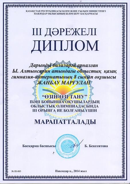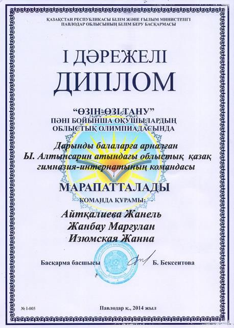 2014 жылғы 9 қазан күні Павлодар қаласының № 24 жалпы орта білім беру мектебенде «Өзін-өзі тану» пәні бойынша республикалық олимпиаданың облыстық кезеңі өтті. Бұл сайысқа біздің мектептен 3 оқушыдан тұратын топ қатысты. Топ мүшелері: Жанбау Марғұлан, Айтқалиева Жанель, Изюмская Жанна. Топ жетекшісі педагог-психолог Аскапова Сайран Кенесарықызы.
